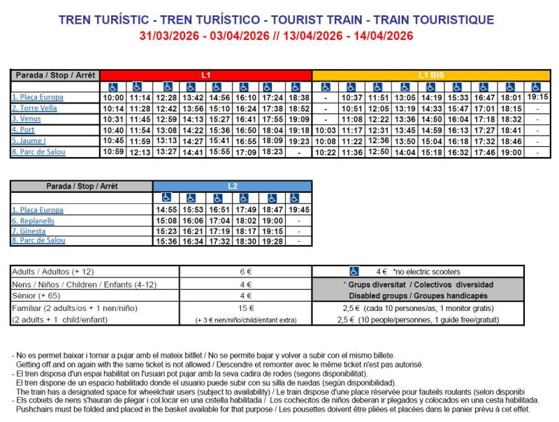 Tots els tiquets es poden comprar directament al tren turístic (temporalment NO admet el pagament amb targeta). NO es pot pujar i baixar del tren turístic amb el mateix bitllet.