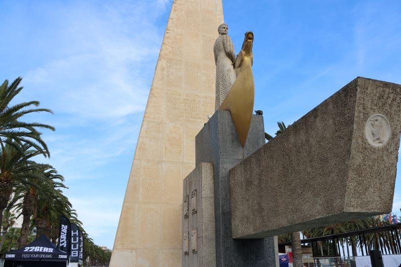 • un monolito en forma de triángulo, recubierto de piedra blanca, de unos 20 metros de altura, que representa la vela del barco